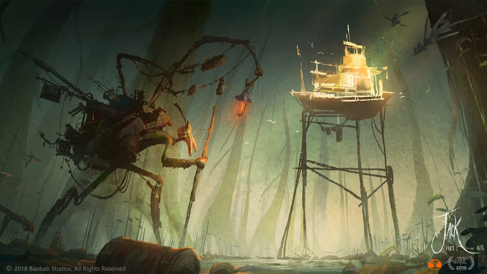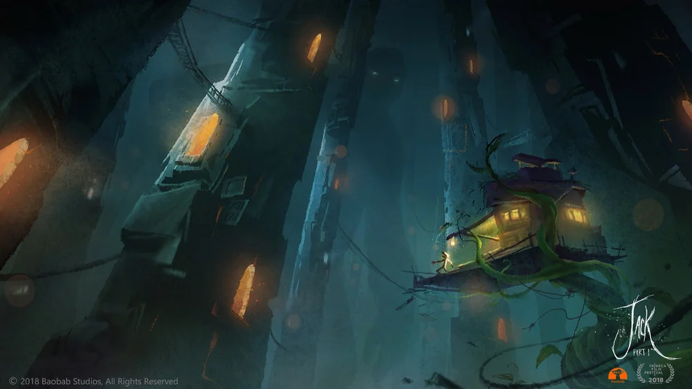 The experience takes place in miyazaki-esque marshland world full of swamp and fog. Inside your family’s stilt house, the situation is dire. Your stern mother instructs you to use the last of her pennied to buy supplies for survival. But onboard the merchant’s boat, you meet a mysterious old man who convinces you to acquire his beans which he claims are magical. Back home your mother could not be more upset and, in her fury, she throws the worthless beans out the window and into the swamp below. At night the magic kicks in! After your mother goes outside to investigate, the entire house is torn apart and you fly up atop the remaining wooden floor, above the clouds. Into the fantastical realm of giants. Then in the giants kitchen, you will meet the giant’s wife - and eventually the giant himself. It will be up to you to not just avoid being eater for dinner… but to bring back home the magical golden harp.